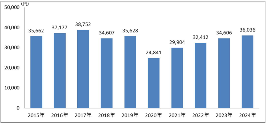 教育研修費用総額を回答企業の正規従業員数で割った「従業員1人あたりの教育研修費用」の2024年度実績額の平均は36,036円で、昨年度より1,430円増加した。1人あたりの教育研修費用は、コロナ禍の2020年度以降は毎年増加傾向にある。