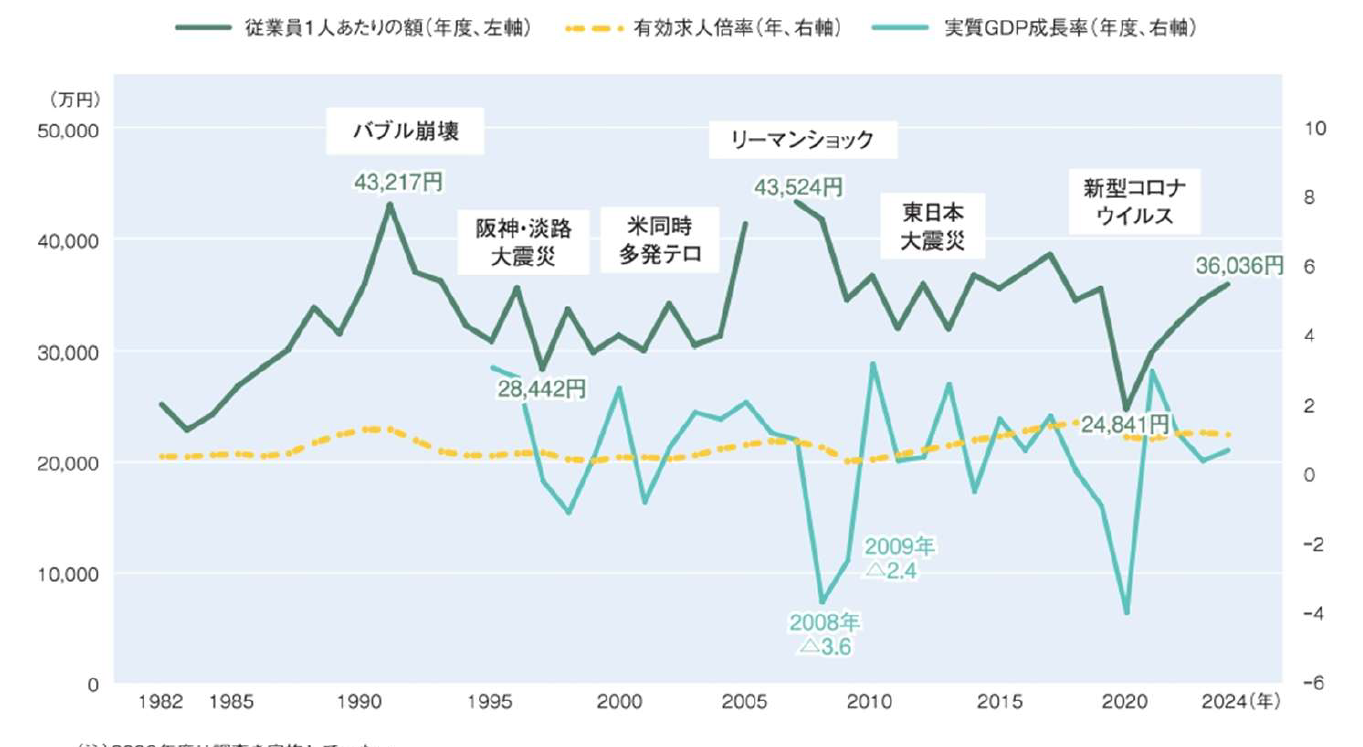 (参考) 従業員1人あたりの額と有効求人倍率・実質GDP成長率の推移