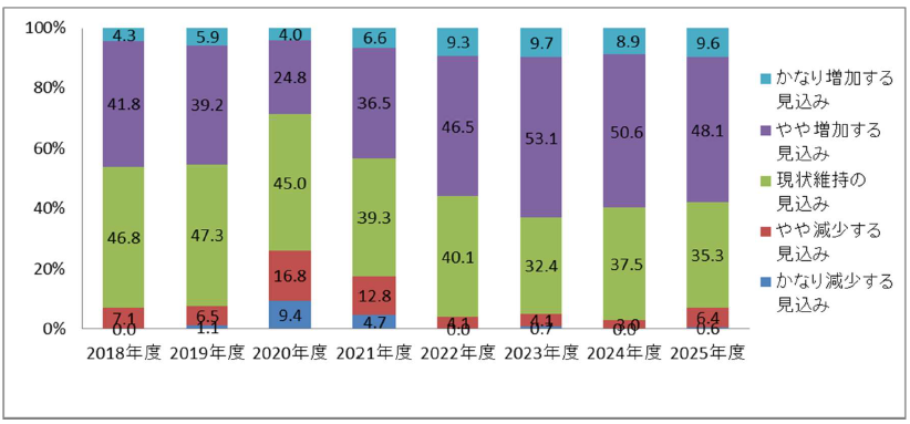 今後(1~3年)の教育研修費用総額については、「かなり増加する見込み」という企業は9.6%、「やや増加する見込み」が48.1%で、合わせて57.7%と、昨年と同様、「増加」見込みが約6割ほどとなった。