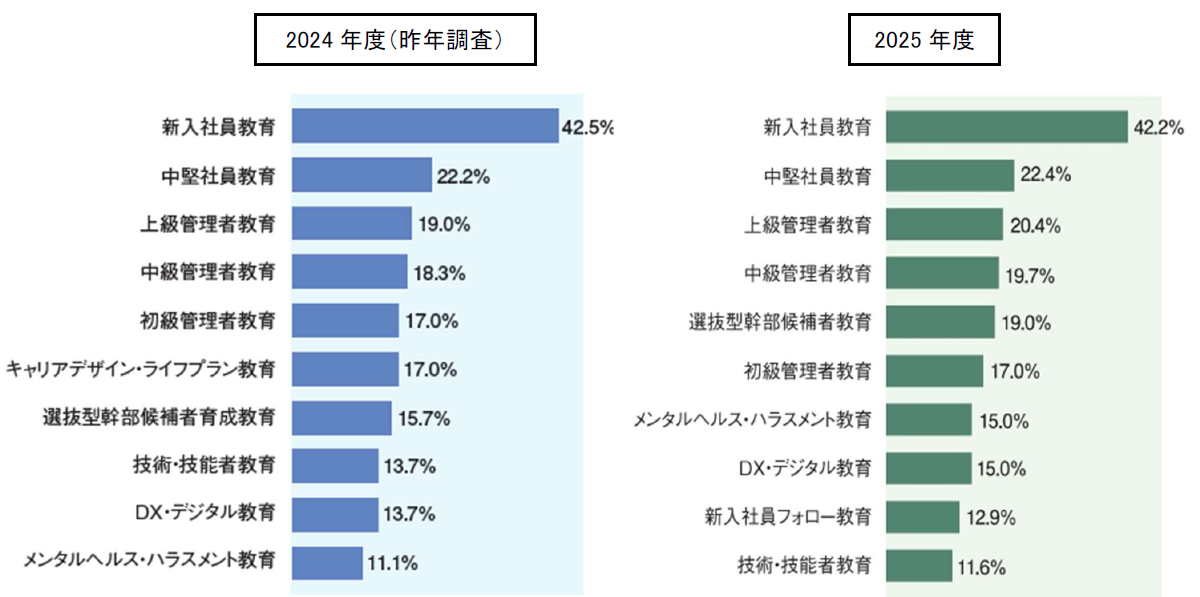 2025年度(今年度)に特に重点的に取り組む教育として、階層別教育8項目と職種別・目的別教育14項目(全22項目)のなかから3つまでを選んで回答してもらったところ、最も多かったのは、例年同様、「新入社員教育」(階層別教育)だった。次いで、「中堅社員教育」(階層別教育)、「上級管理者教育」(階層別教育)などとなっている。